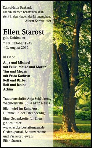 Heute hat uns die traurige Nachricht erreicht, dass unsere ehemalige Übungsleiterin, Diplom Sportlehrerin Ellen Starost, in der letzten Woche leider verstorben ist. Ellen Starost hat von 1989 bis 2001 die Gruppe Fitness Mix erfolgreich geleitet und trainiert. Unsere ganze Anteilnahme gilt Ihren Familienangehörigen.